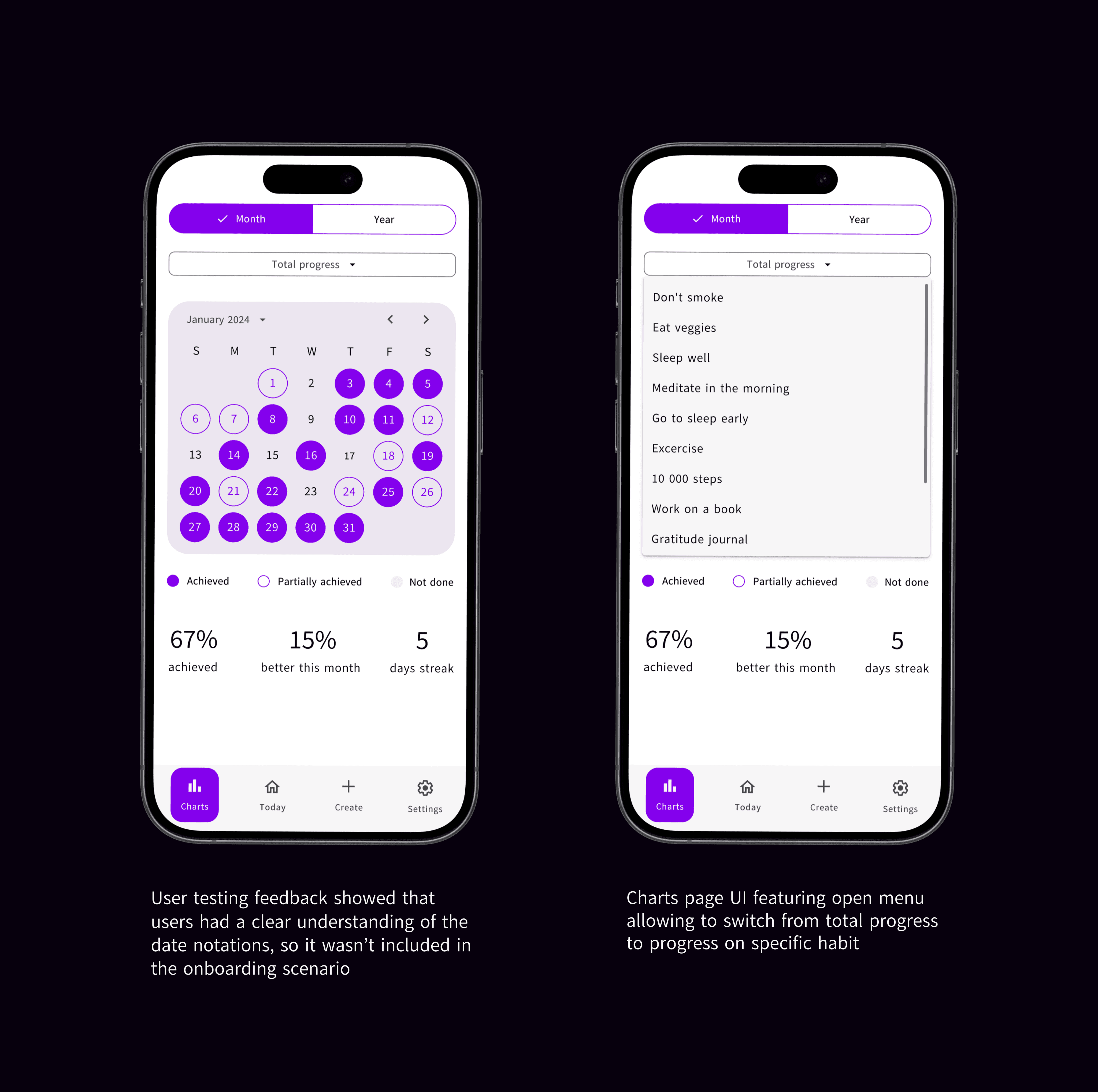 The goal of the statistics UI design was to display the user's progress in a visually engaging way, motivating them to continue using the app and improve their life with positive habits. In line with feedback from user testing, I incorporated two onboarding screens to familiarize users with the various types of statistics offered by the app when they first accessed the tab.