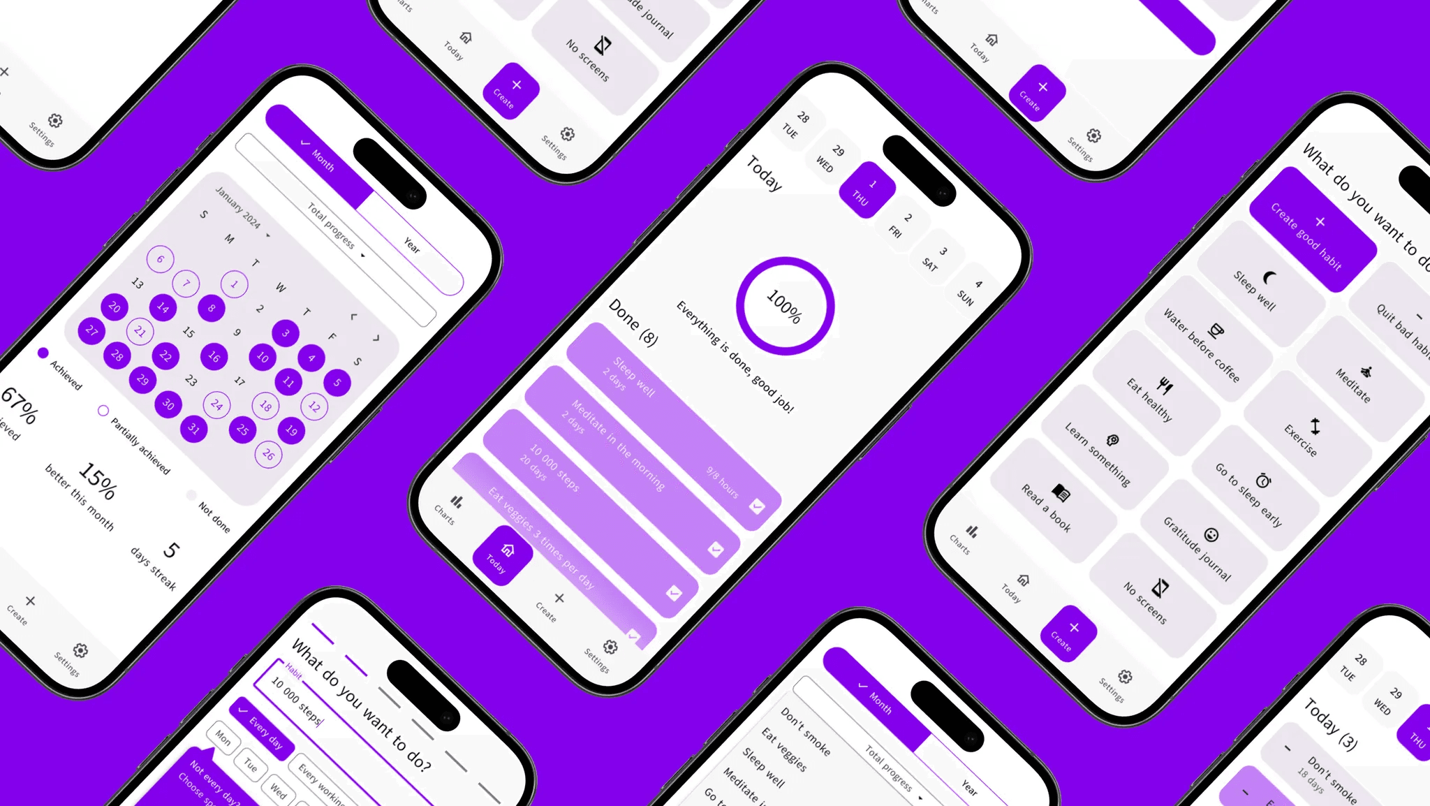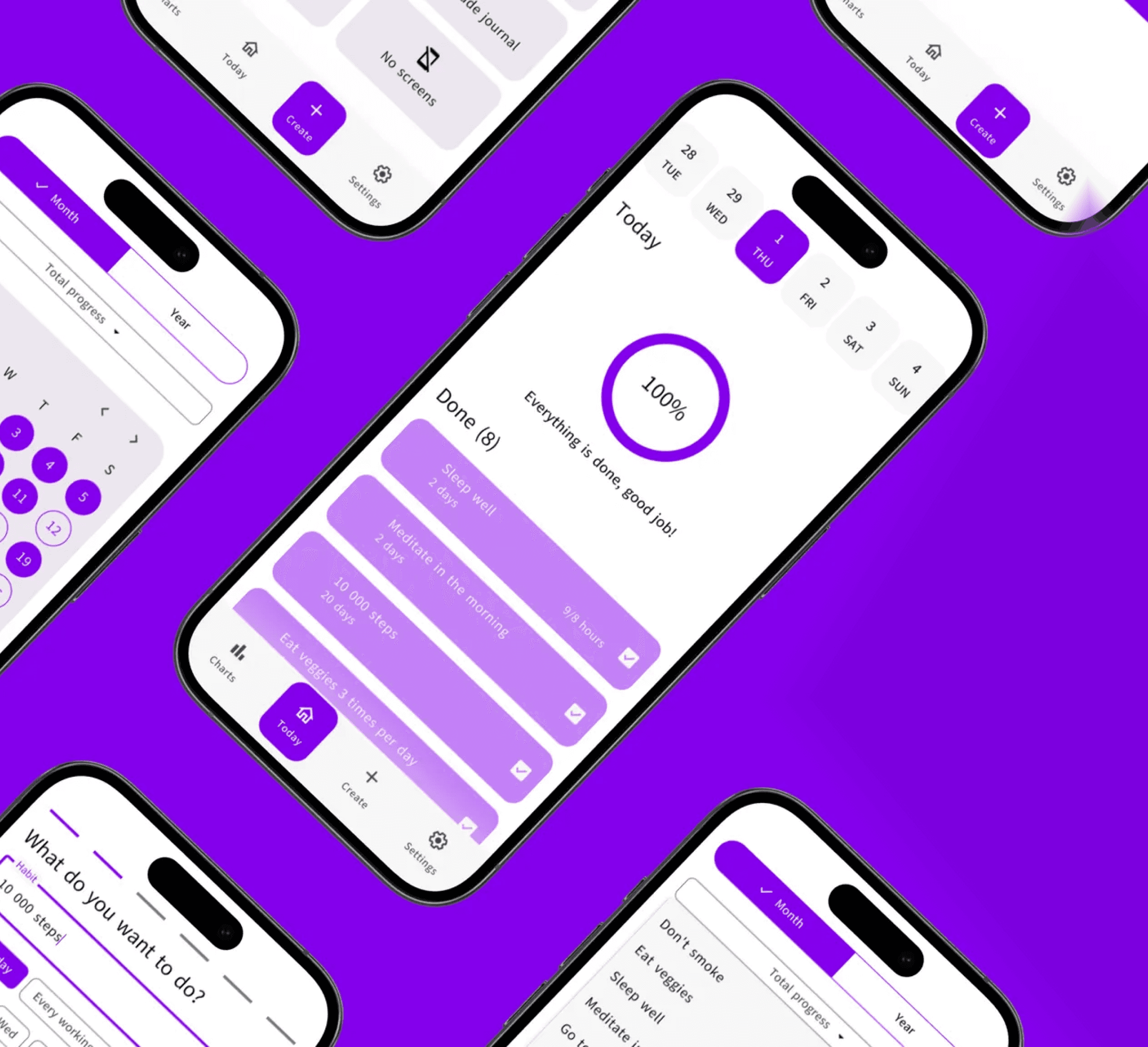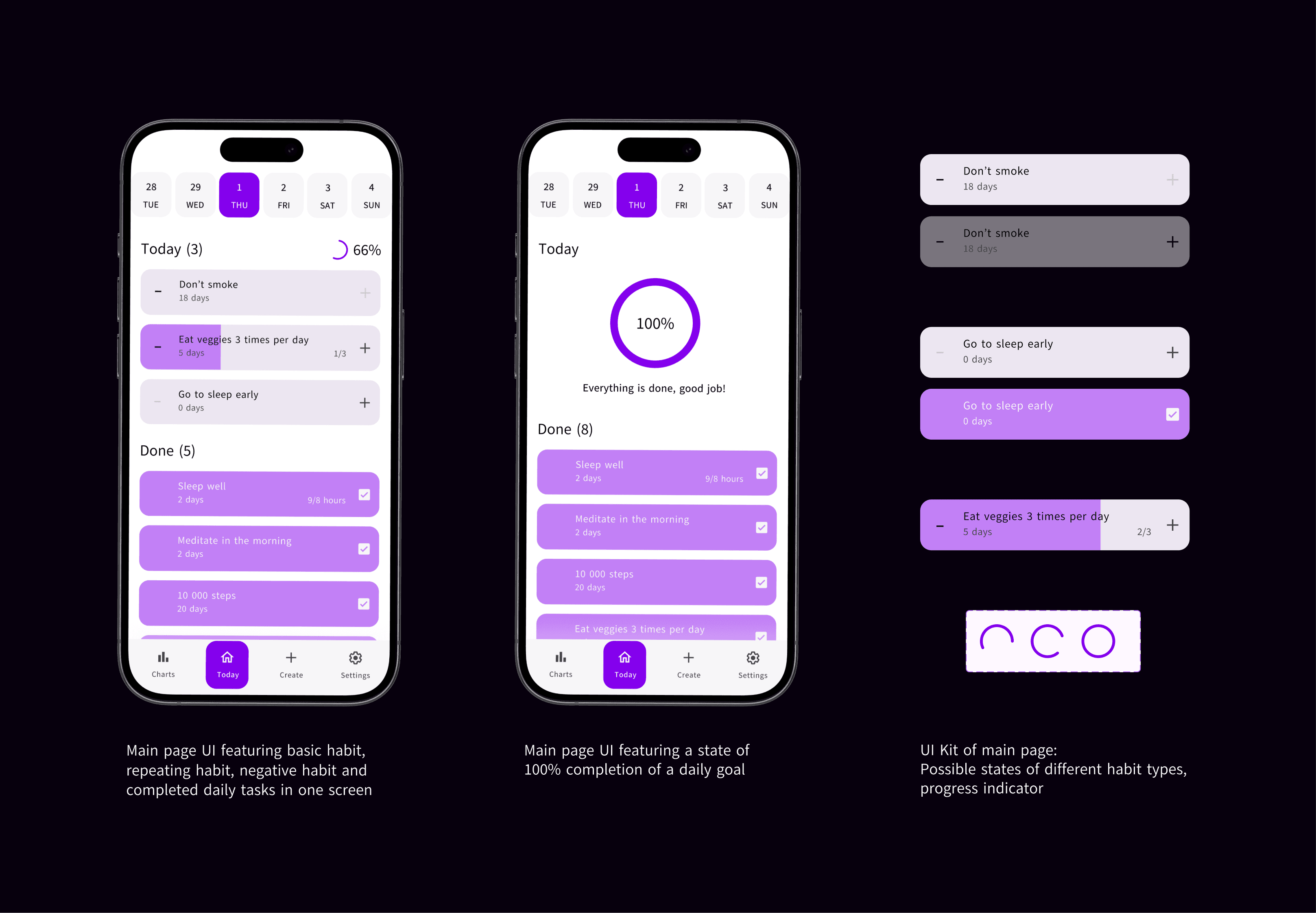 As a component of the larger $4.5 trillion wellness market, habit tracking apps have carved out a significant niche, serving an estimated 75 million users worldwide as of 2023. They are on track to see substantial user growth, reflecting the shifting priorities towards self-care and productivity enhancement. To create a mobile app that not only assists users in cultivating positive habits through pattern recognition and repetition but also provides support for breaking unhealthy ones. One of the goals was to create a design that would look equally good on smaller phones such as the new iPhone SE (2022).